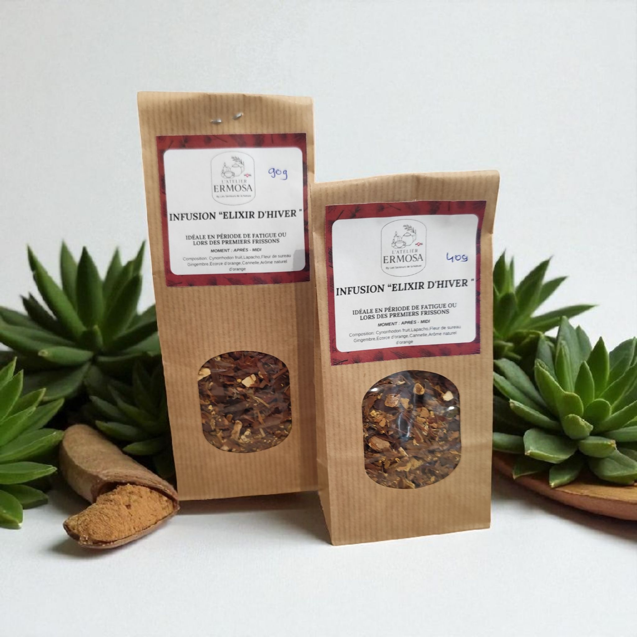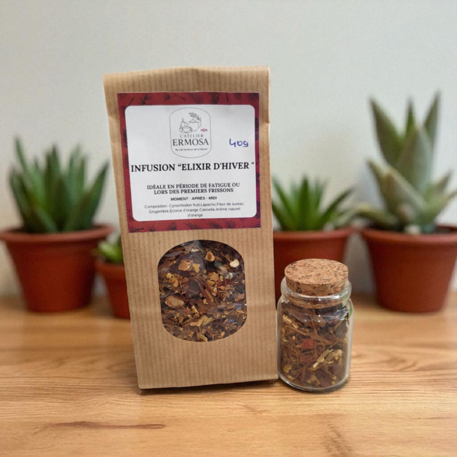 Idéale en période de fatigue ou lors des premiers frissons, l’infusion Élixir d'Hiver associe les bienfaits du lapacho et du cynorrhodon à la chaleur épicée du gingembre et de la cannelle. L’orange et la fleur de sureau viennent adoucir l’ensemble pour offrir une boisson réconfortante, parfaite pour traverser l’hiver avec vitalité.