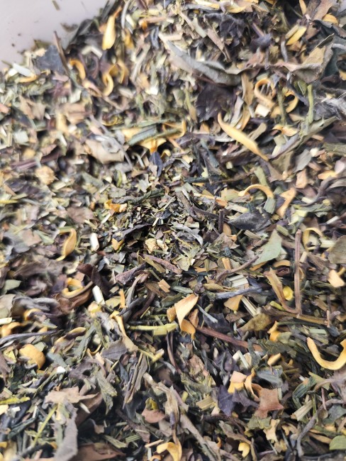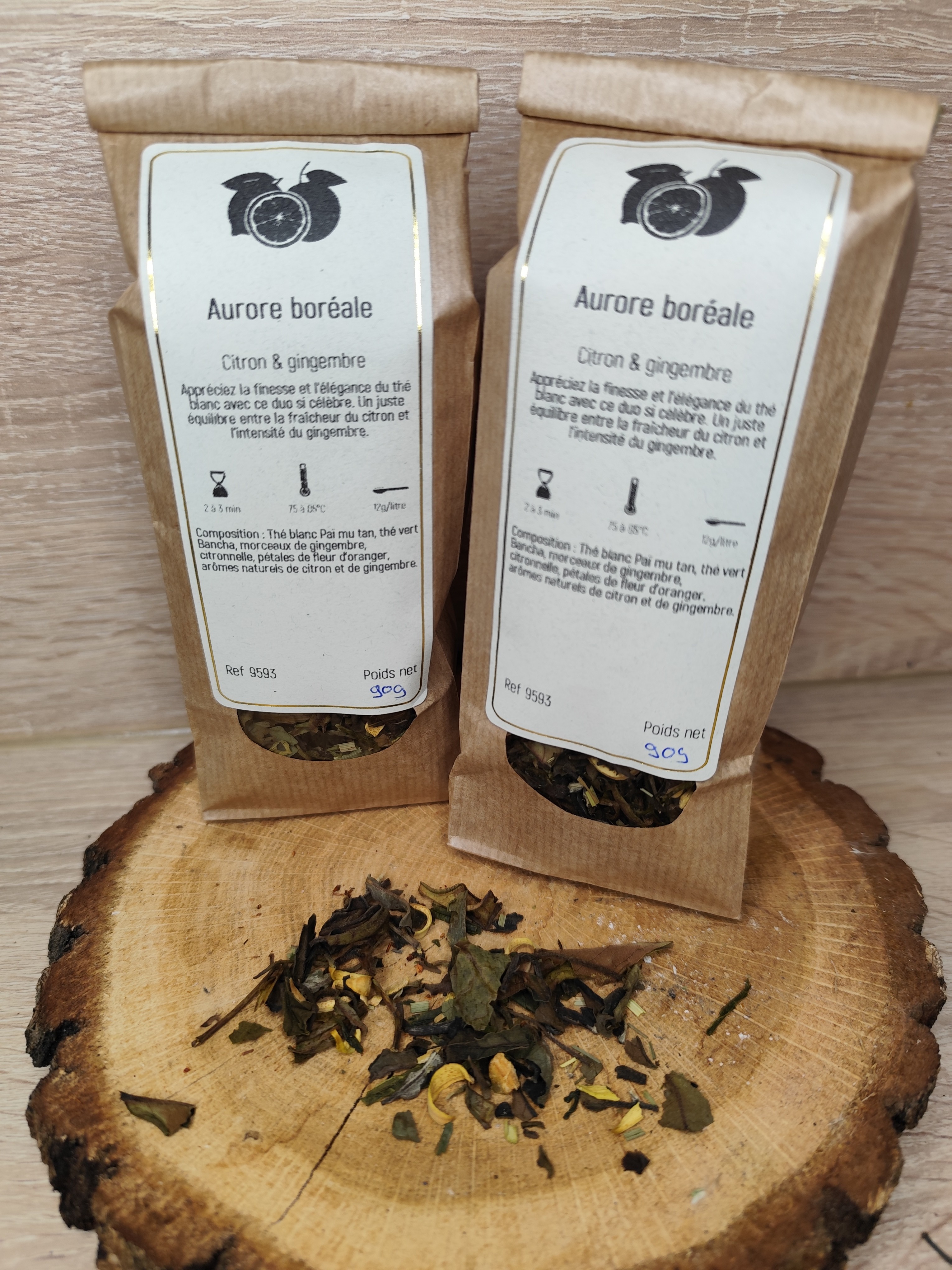 Thé blanc Paï Mu Tan, thé vert Bancha, morceaux de gingembre, citronnelle, pétales de fleur d’oranger, arômes naturels de citron et de gingembre.