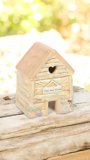 Alliez parfum et charme champêtre pastel avec ce brûleur à huile en céramique en forme de poulailler, orné d'une découpe en forme de cœur et d'une adorable pancarte « Le Poulailler »