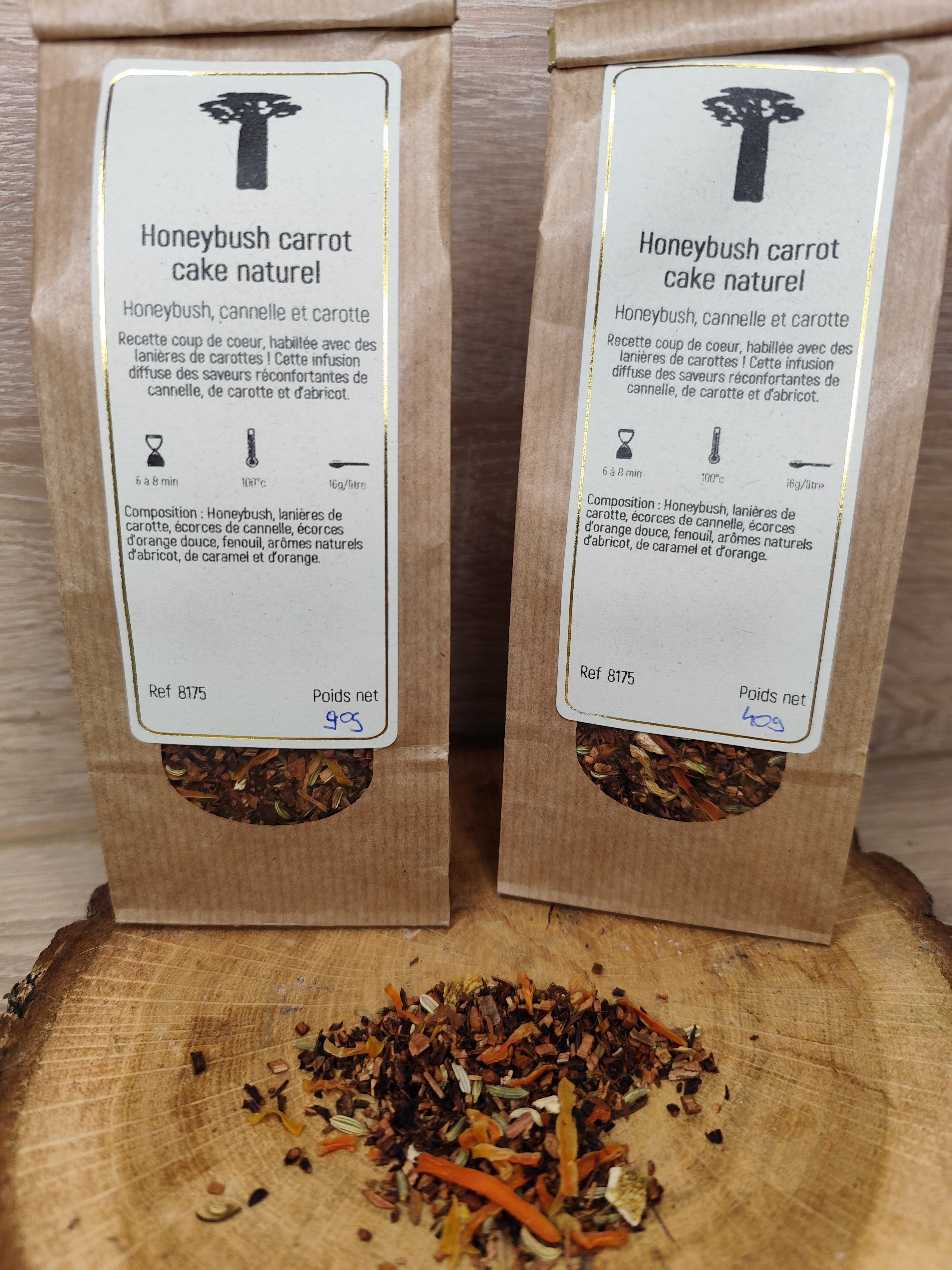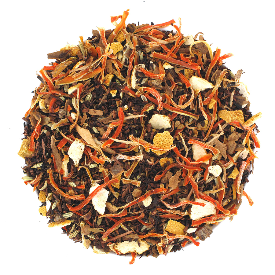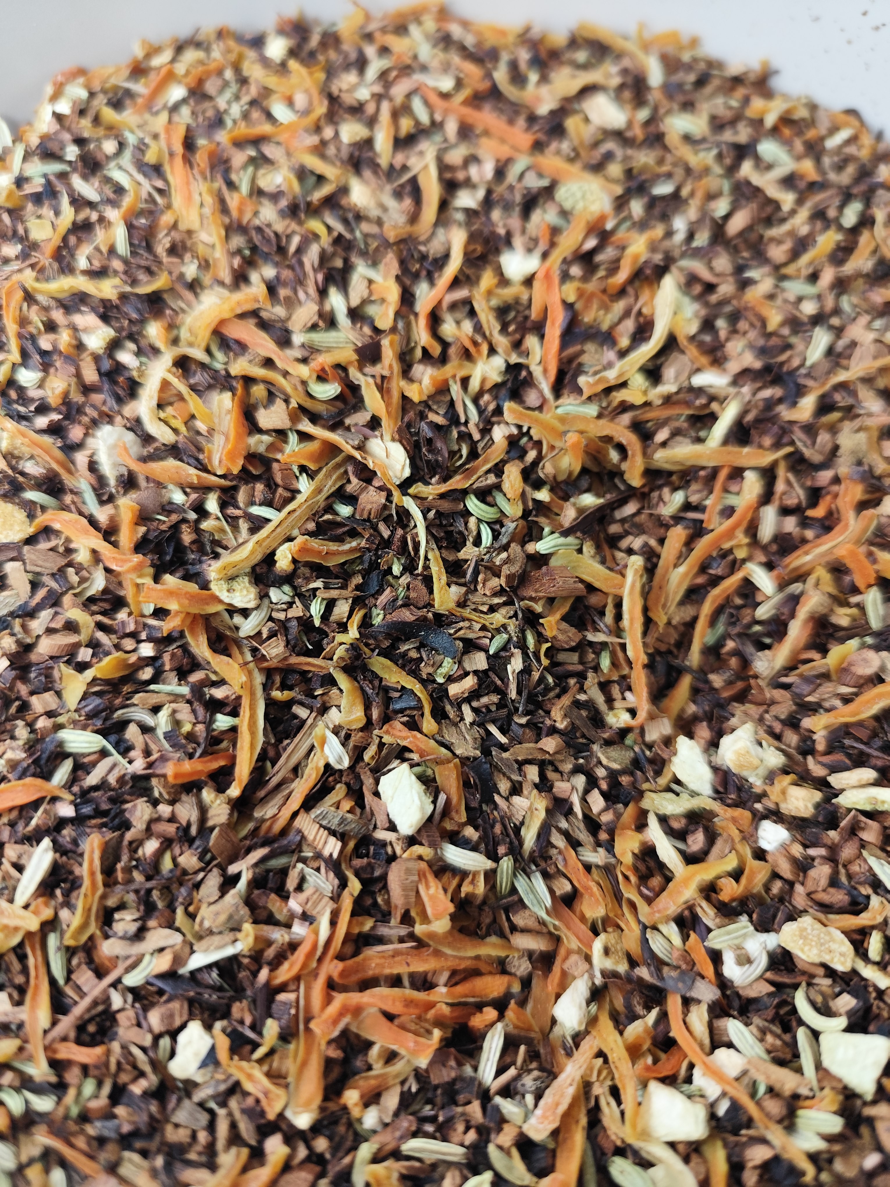 Composition : Honeybush*, lanières de carotte*, écorces de cannelle*, écorces d'orange douce*, fenouil*, arômes naturels* d'abricot, de caramel et d'orange.