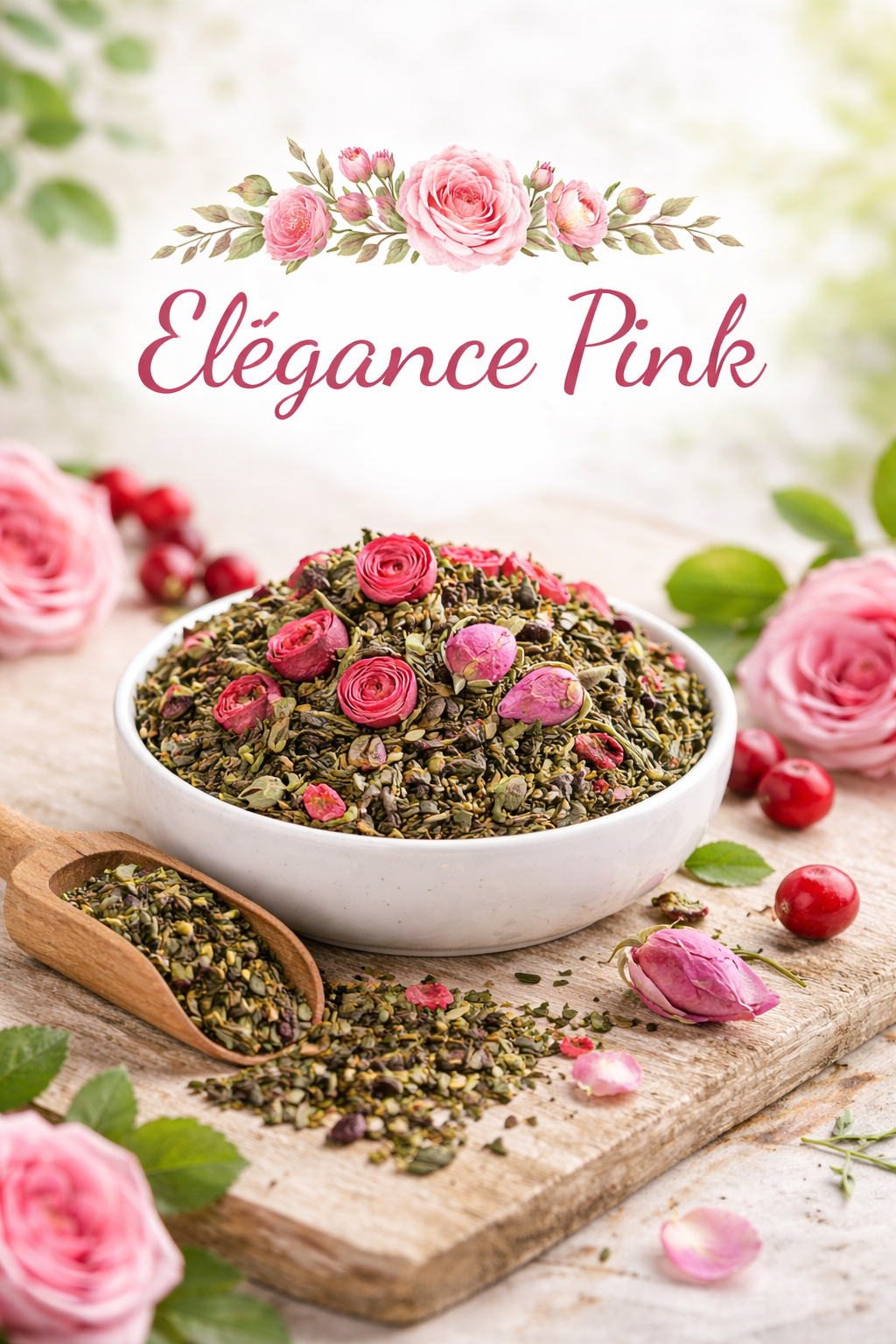 Un thé vert Sencha raffiné, délicatement associé à des boutons de rose, des canneberges et des framboises.