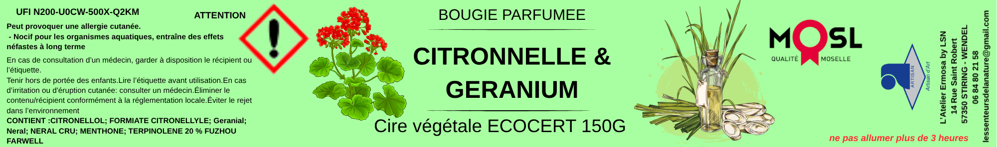Son parfum délicat associe la vivacité citronnée de la citronnelle à la finesse florale du géranium, créant une atmosphère fraîche, naturelle et apaisante. Idéale pour accompagner vos moments de détente à la maison.