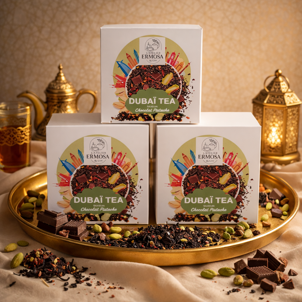 Laissez-vous transporter au cœur du raffinement oriental avec notre Thé Noir Dubaï Chocolat Pistache, une création gourmande et envoûtante inspirée du luxe et des saveurs emblématiques du Moyen-Orient.