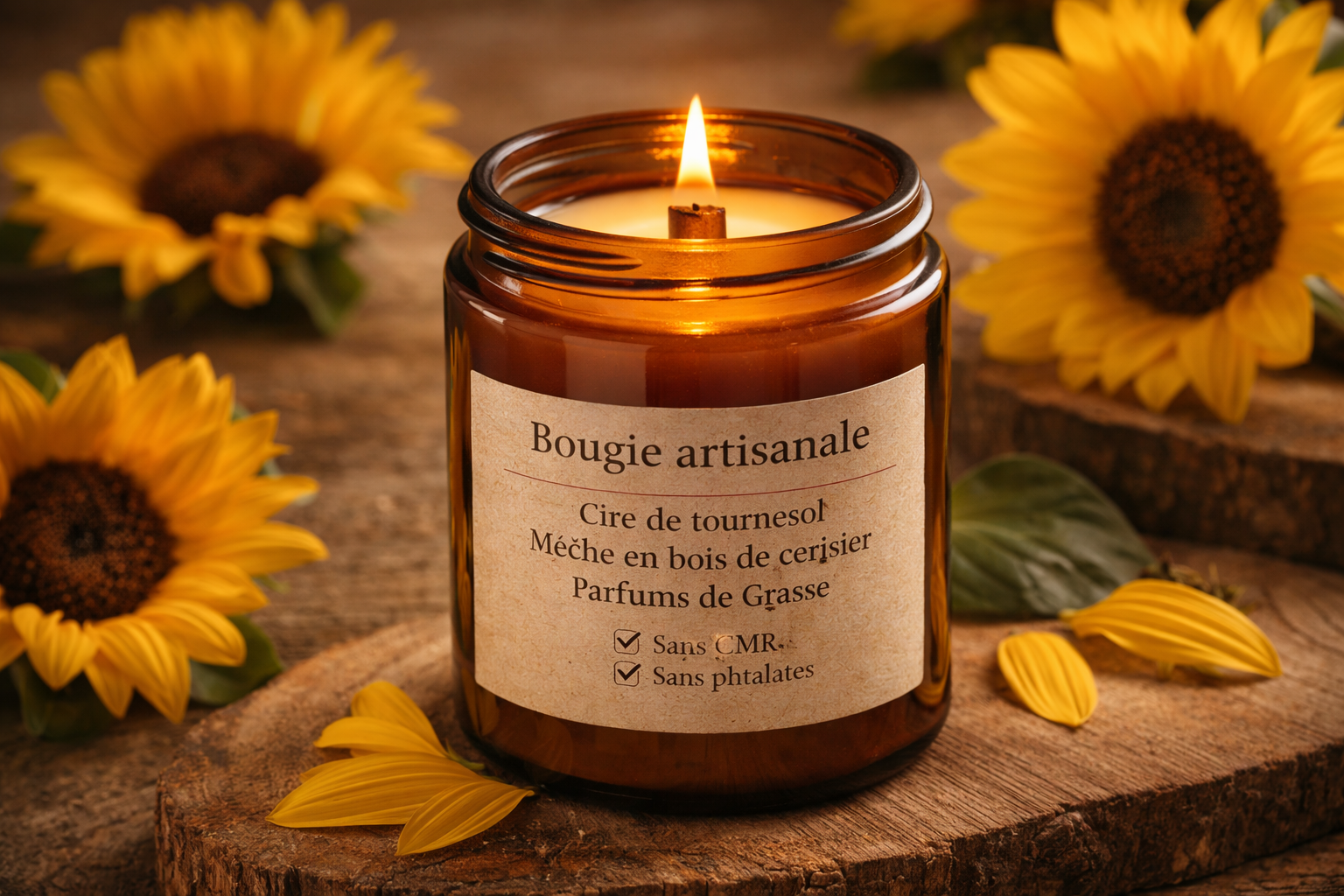 Chaque bougie est coulée à la main avec une cire de tournesol, une alternative végétale encore peu utilisée, que nous avons choisie pour nous démarquer des bougies classiques à base de cire de soja ou de colza. Cette cire originale offre une combustion propre, une excellente diffusion du parfum et une démarche plus responsable et innovante.